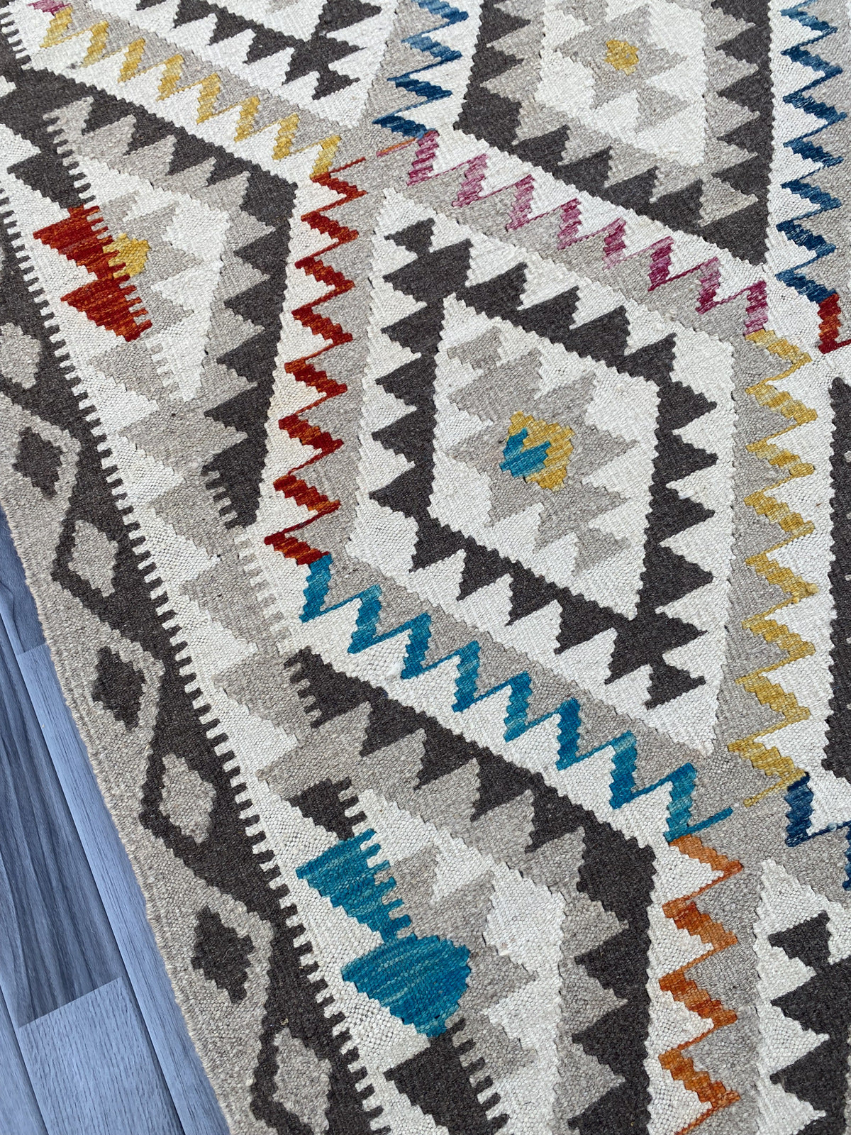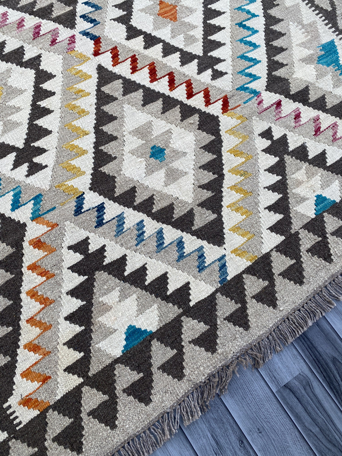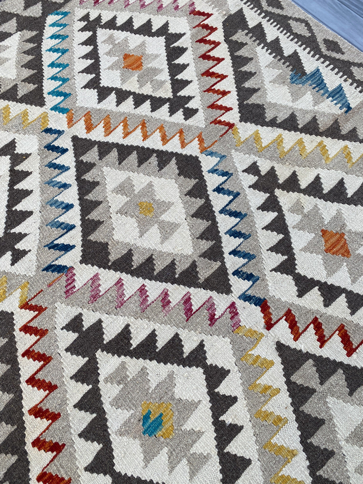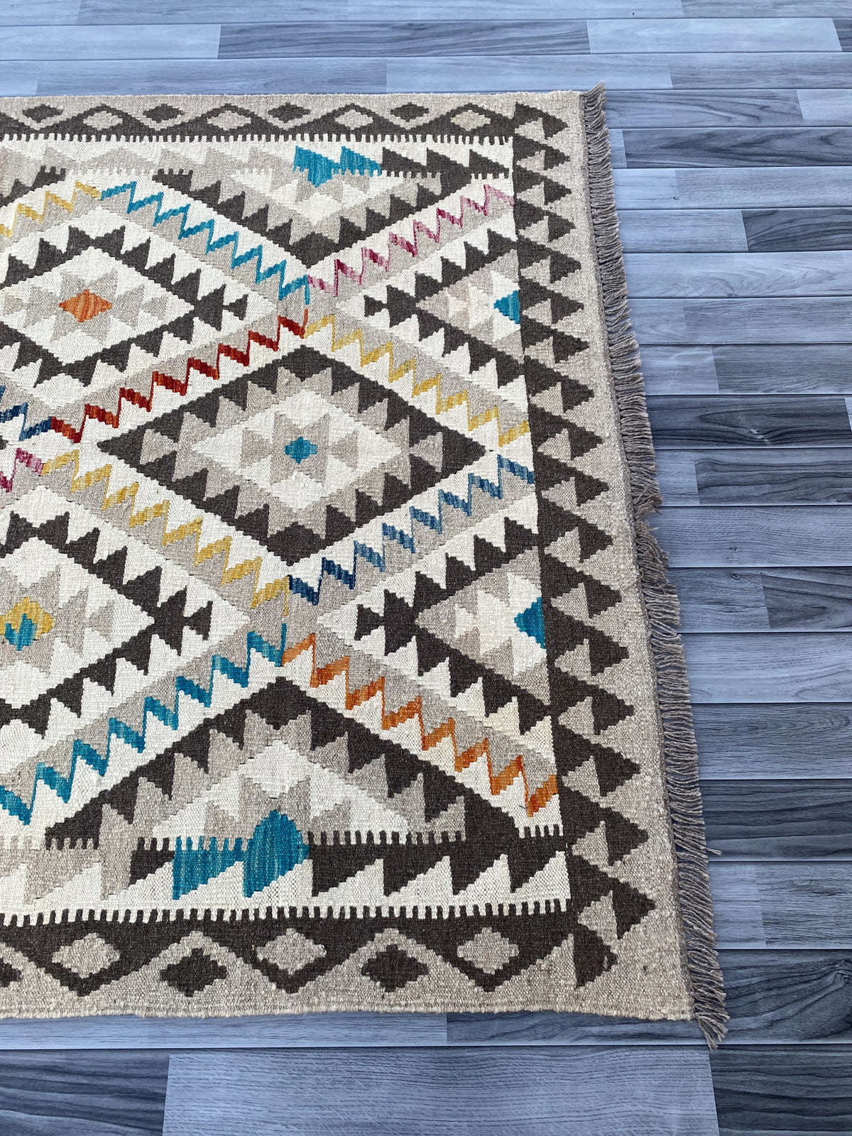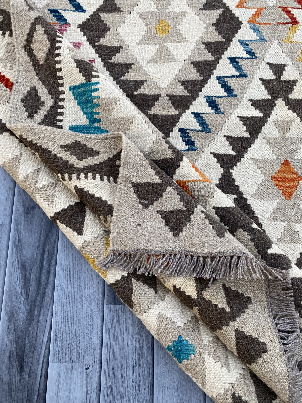 Kilims are woven differently to rugs and do not have a pile, allowing you to use both sides. This flexibility is efficient and practical, allowing you to get the most out of your handmade piece. Kilims are famous for its geometrical patterns, vibrant colours, and unique texture. This kilim has been handwoven from 100% wool in Afghanistan. This kilim is handcrafted to last you a decade and will not fail to impress