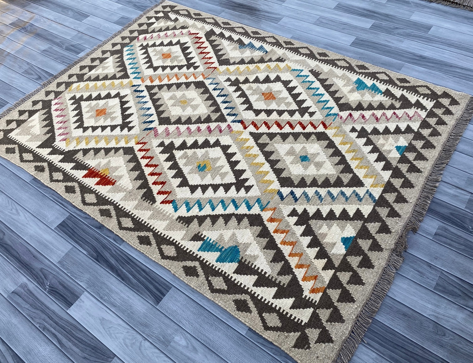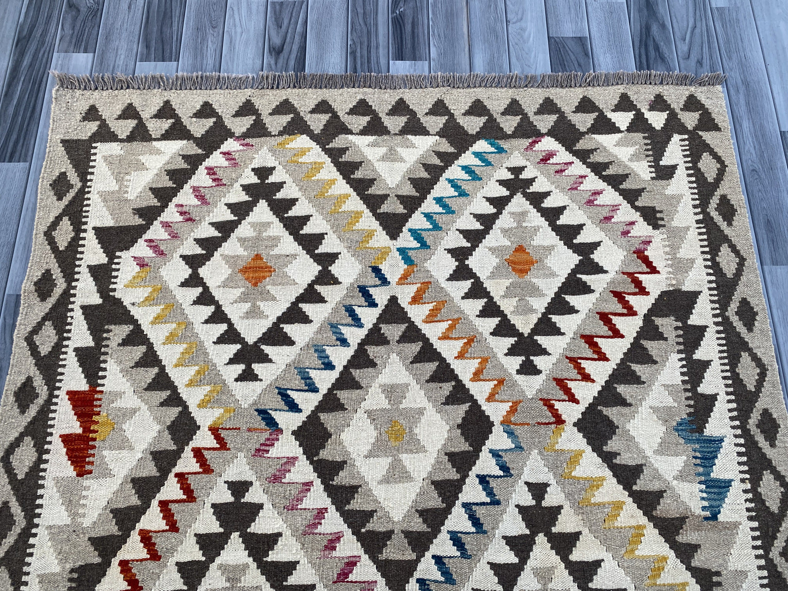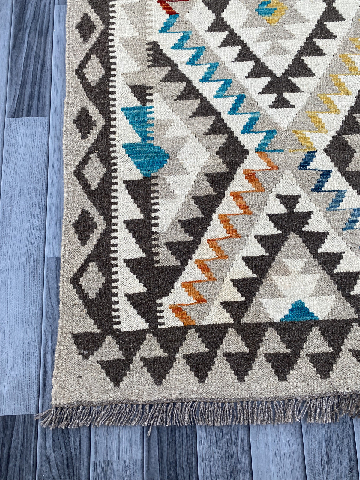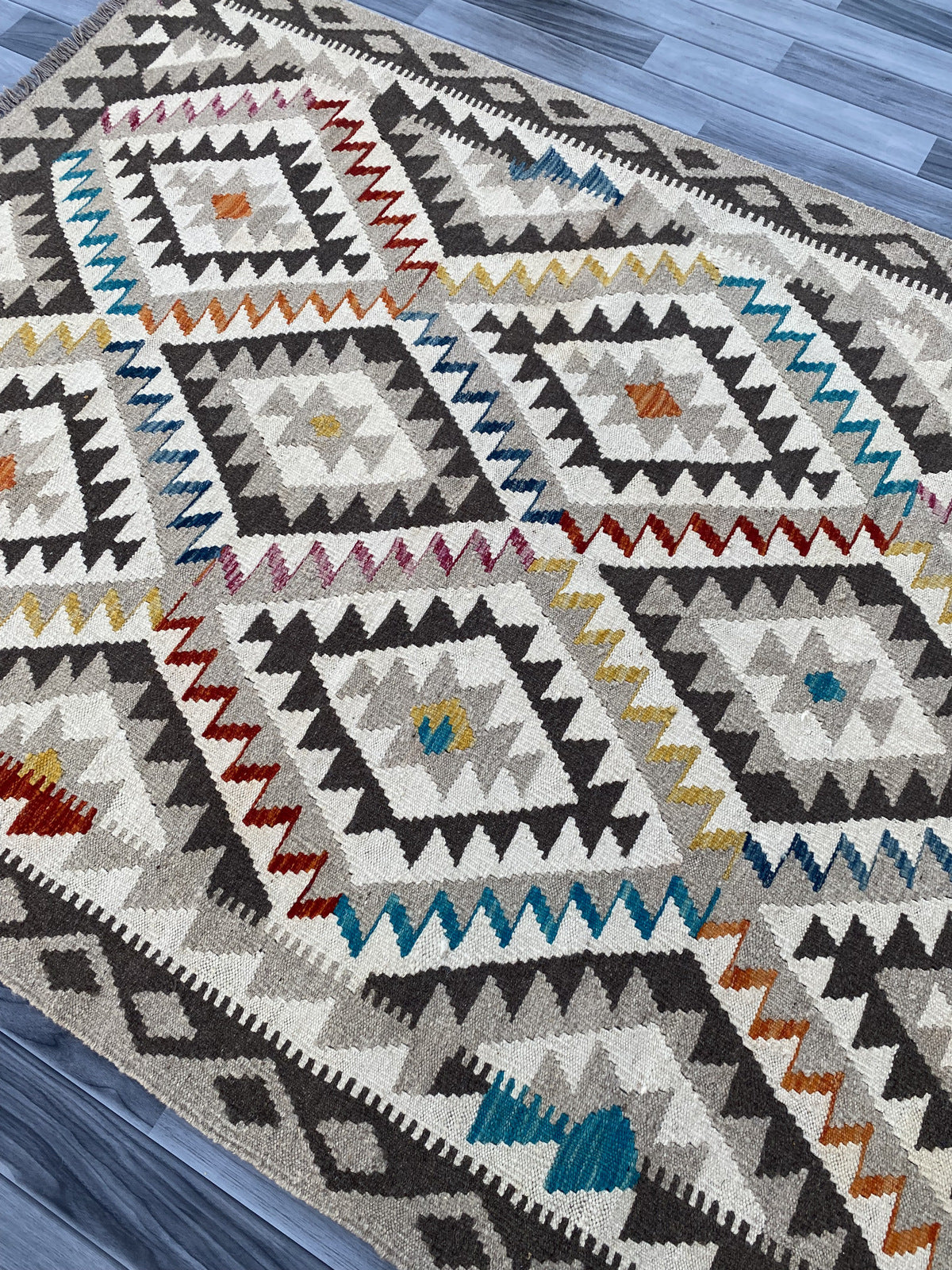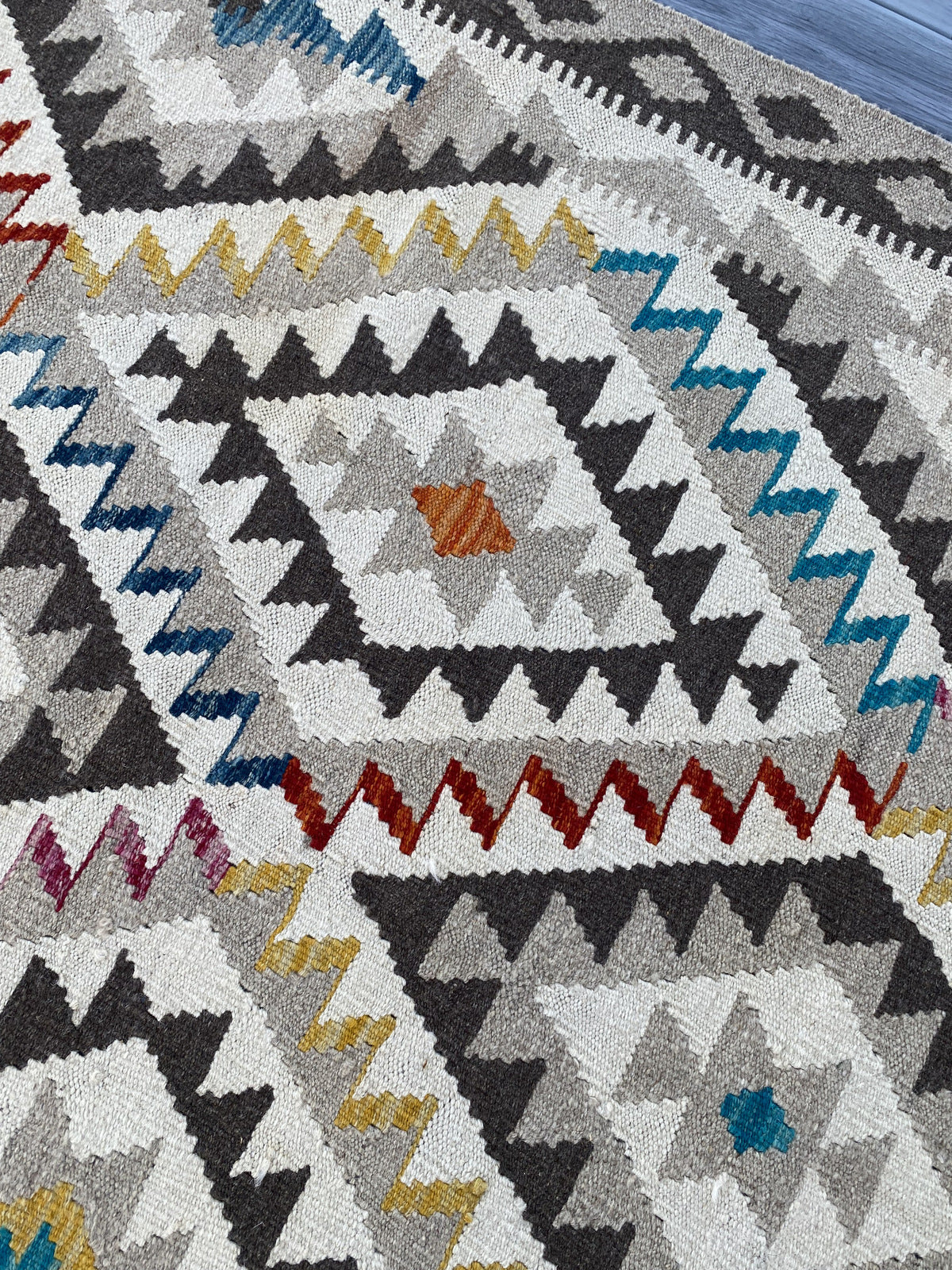 Kilims are woven differently to rugs and do not have a pile, allowing you to use both sides. This flexibility is efficient and practical, allowing you to get the most out of your handmade piece. Kilims are famous for its geometrical patterns, vibrant colours, and unique texture. This kilim has been handwoven from 100% wool in Afghanistan. This kilim is handcrafted to last you a decade and will not fail to impress