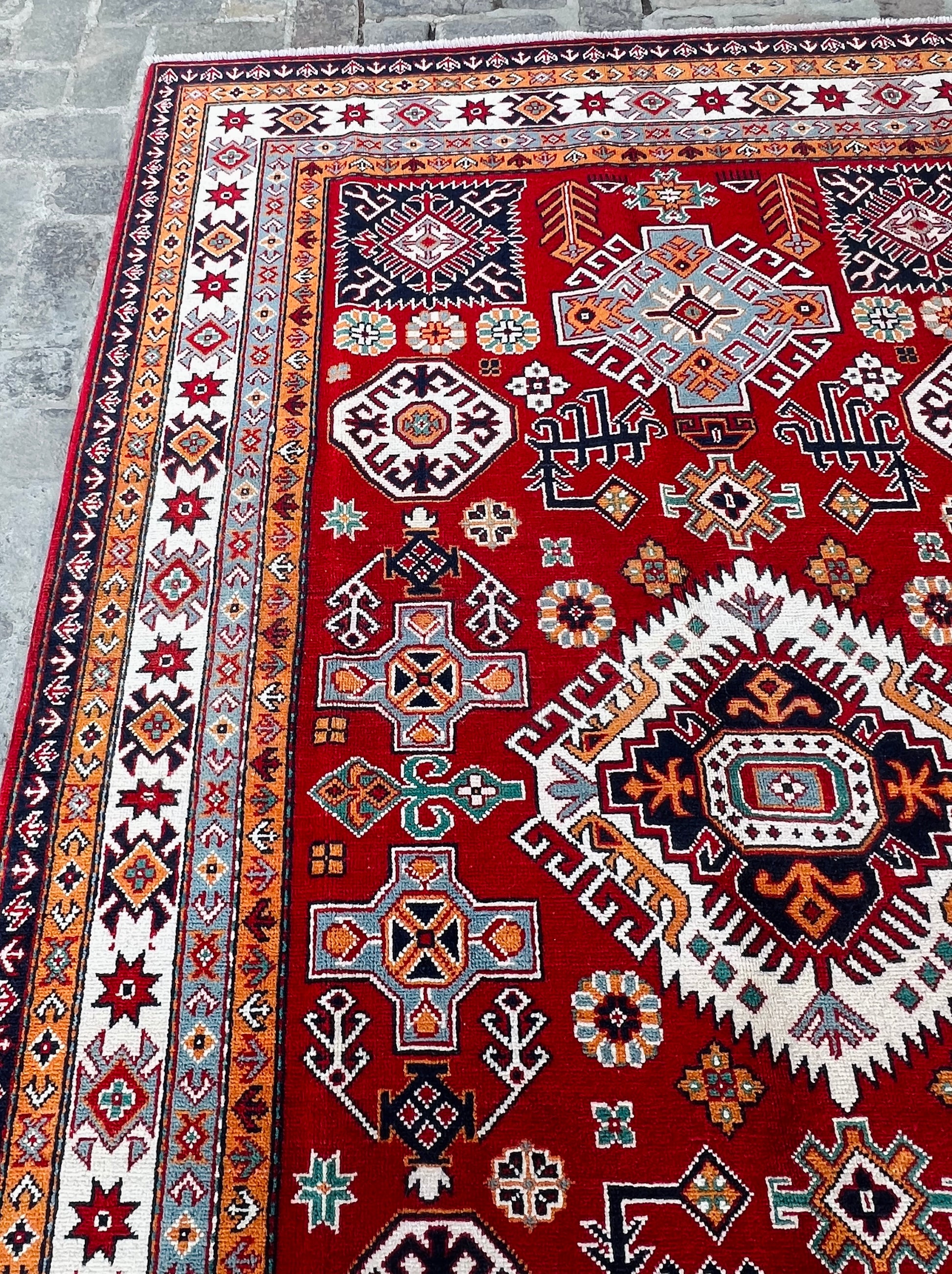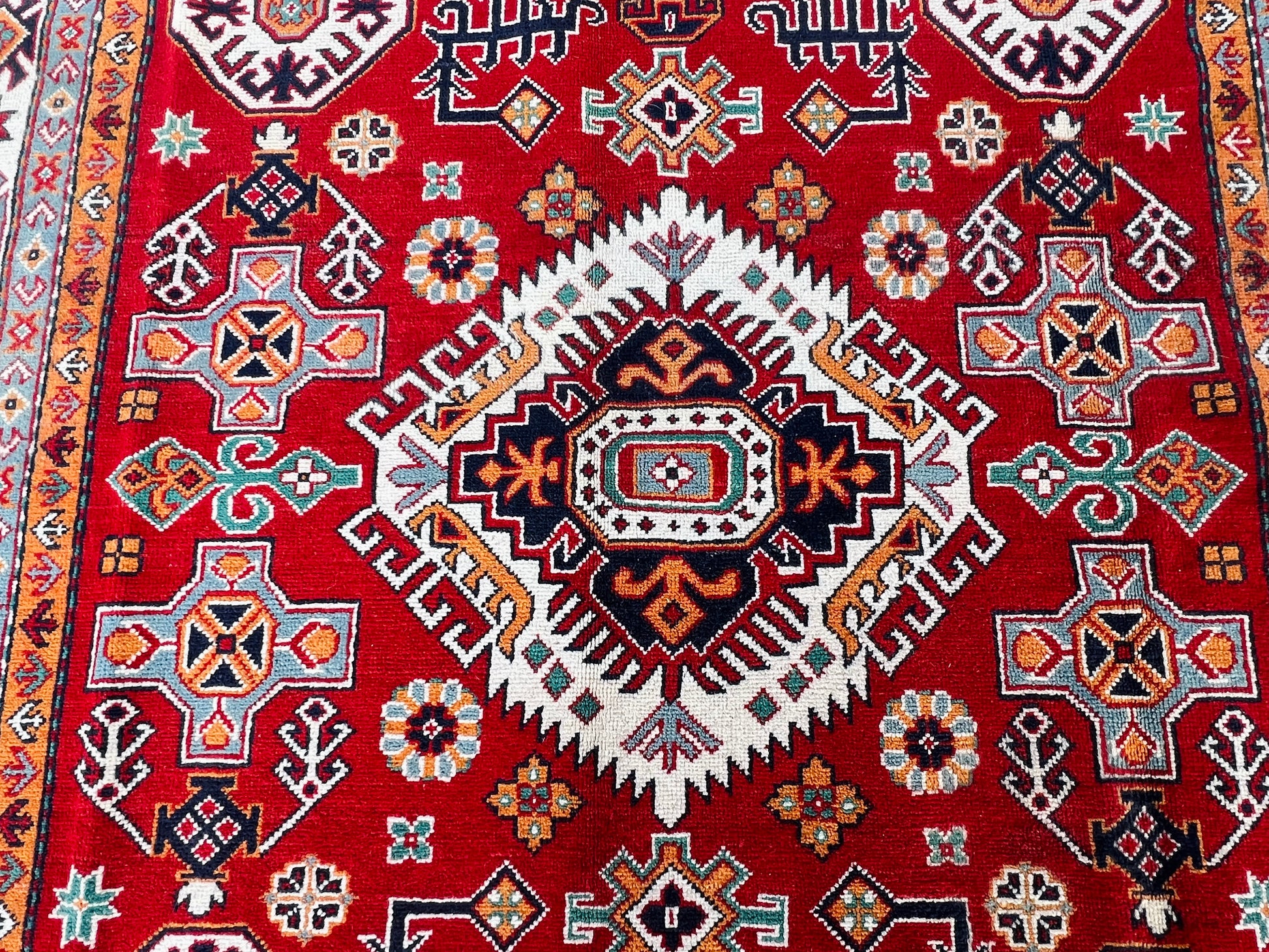 - Features distinctive Kazak patterns with rich, colors that maintain their vibrancy