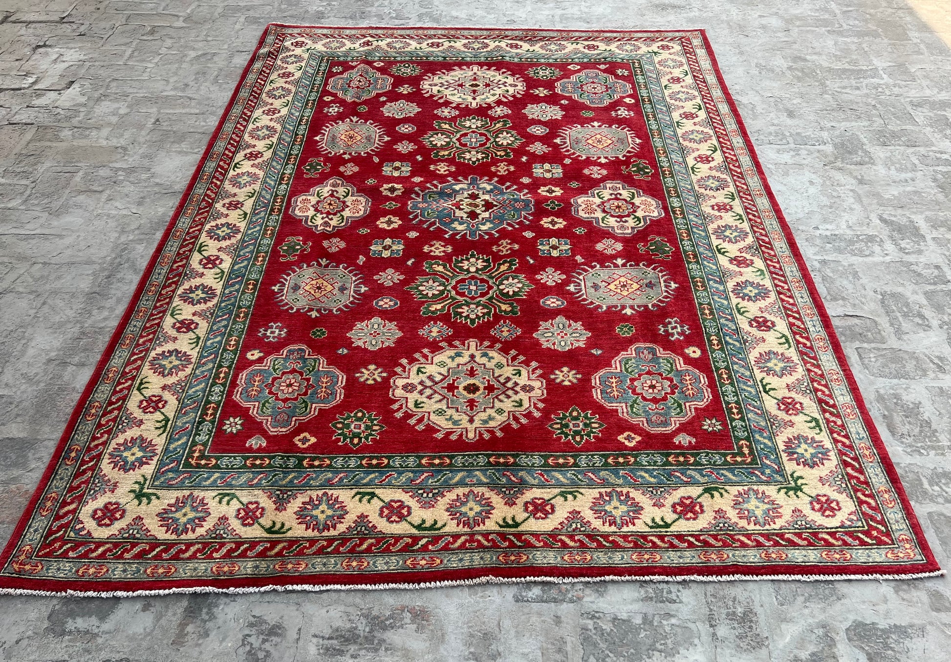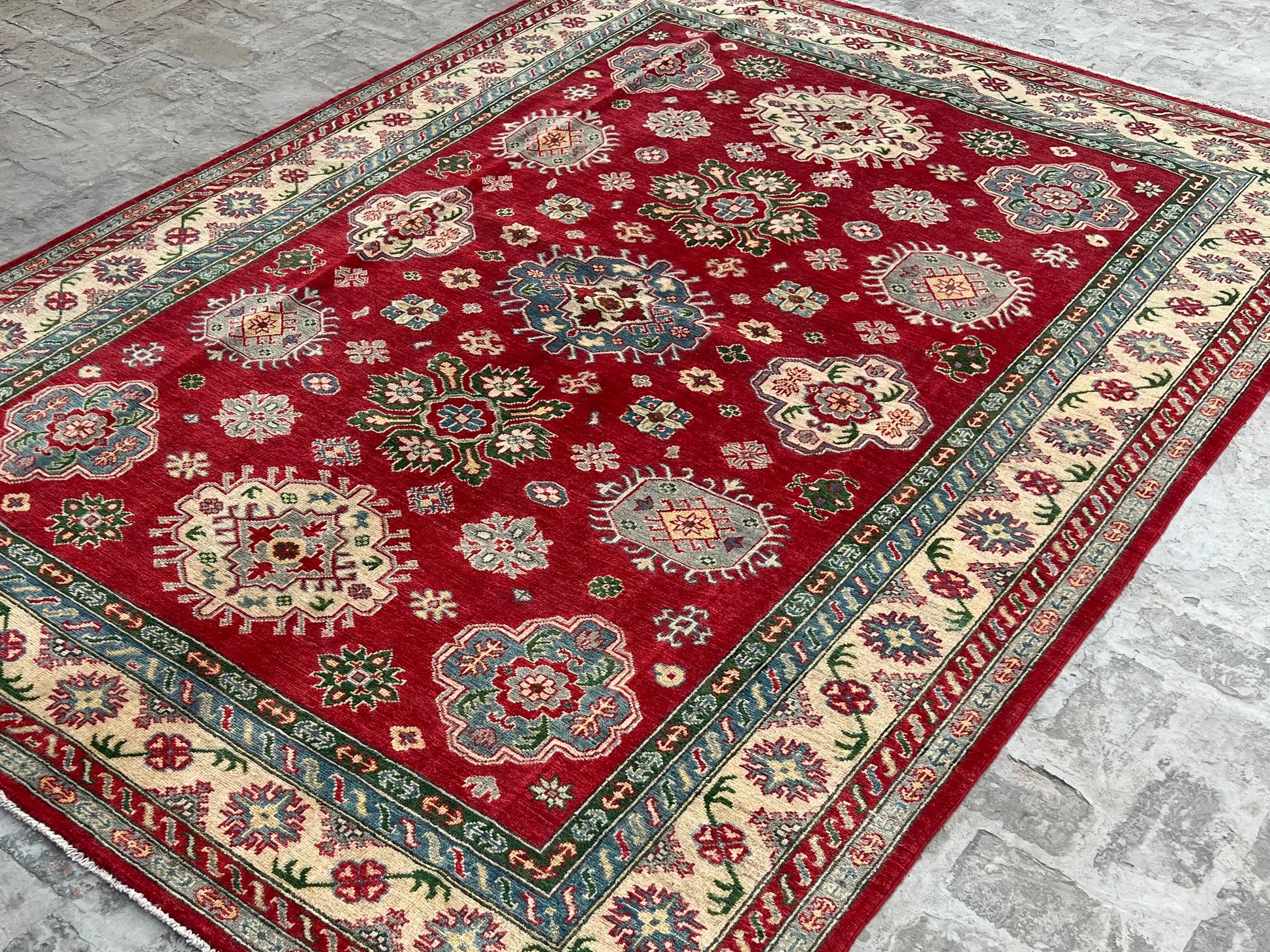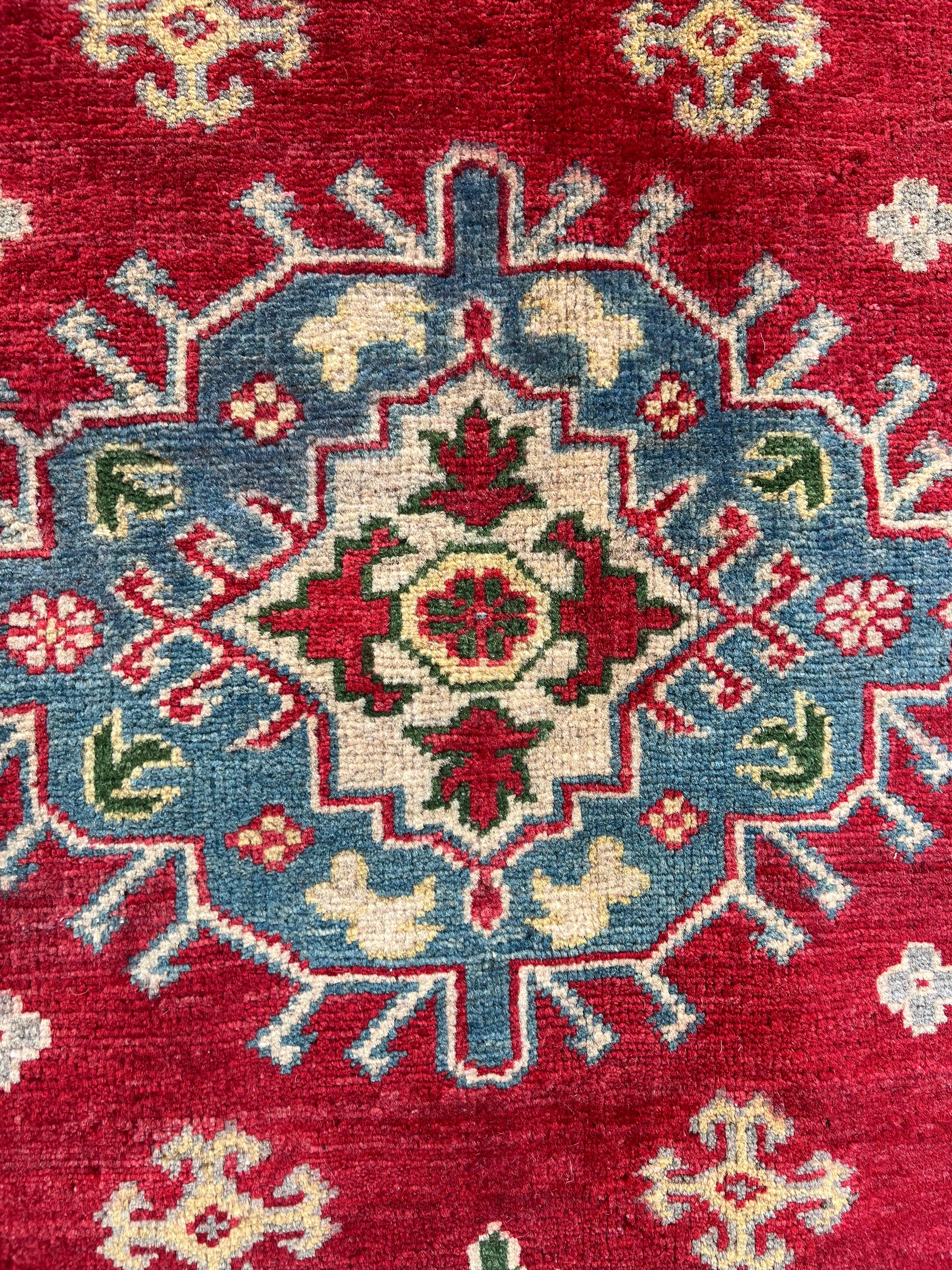 - Features distinctive Kazak patterns with rich, colors that maintain their vibrancy