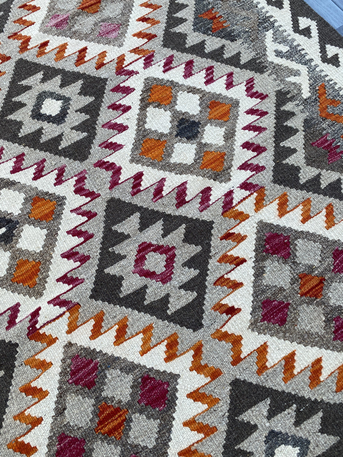 Kilims are woven differently to rugs and do not have a pile, allowing you to use both sides. This flexibility is efficient and practical, allowing you to get the most out of your handmade piece. Kilims are famous for its geometrical patterns, vibrant colours, and unique texture. This kilim has been handwoven from 100% wool in Afghanistan. This kilim is handcrafted to last you a decade and will not fail to impress