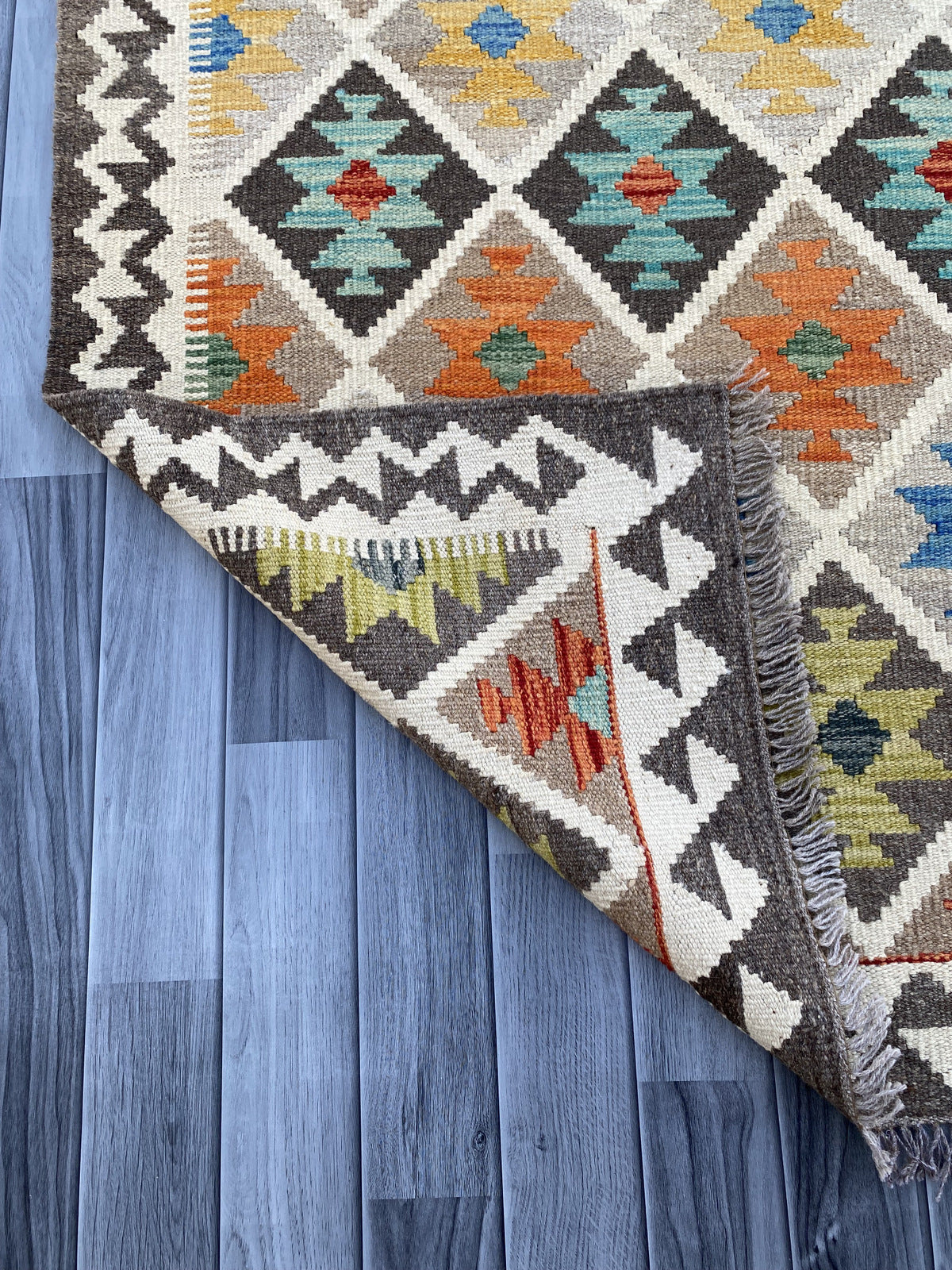 Kilims are woven differently to rugs and do not have a pile, allowing you to use both sides. This flexibility is efficient and practical, allowing you to get the most out of your handmade piece. Kilims are famous for its geometrical patterns, vibrant colours, and unique texture. This kilim has been handwoven from 100% wool in Afghanistan. This kilim is handcrafted to last you a decade and will not fail to impress