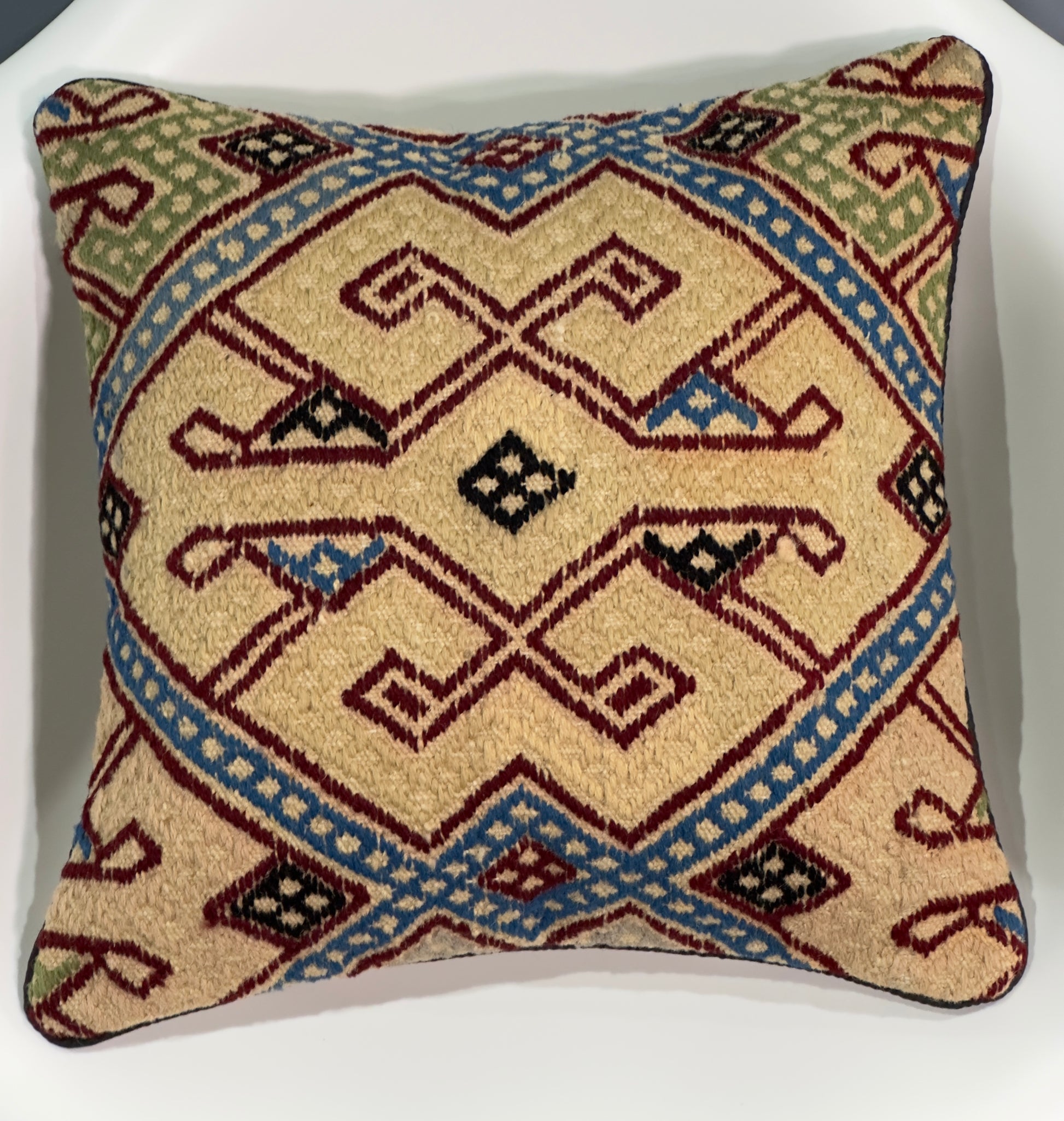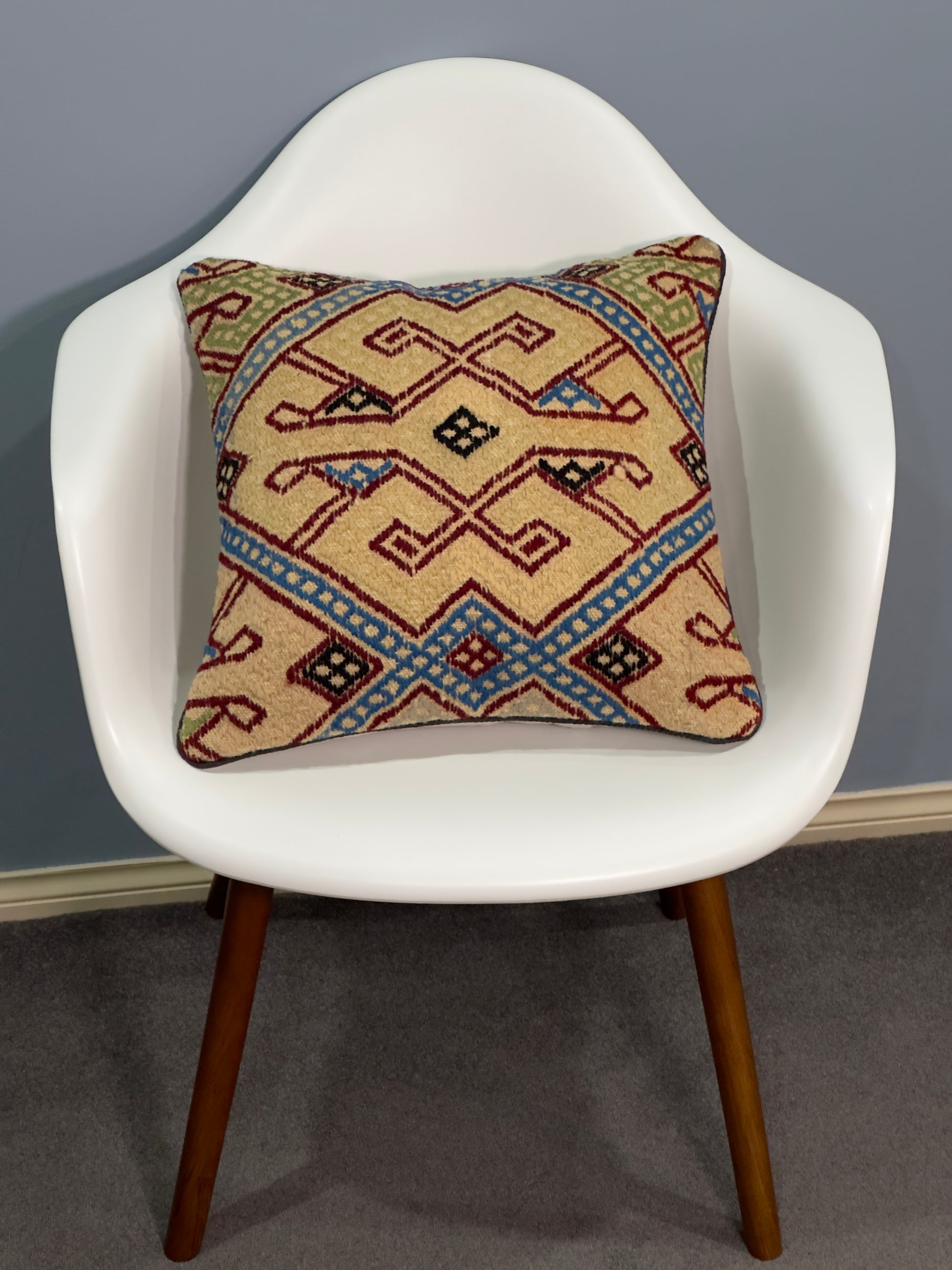 Add a touch of authentic Afghan style to your living space with this handmade kilim cushion cover. Measuring 45cm x 45cm and made from 100% wool, this cushion cover features a beautiful multi-coloured woven pattern that is sure to catch the eye. Crafted by skilled artisans in Afghanistan, this cushion cover is a genuine piece of kilim art that offers both comfort and style. Perfect for dressing up any couch or armchair, it is a unique addition to any home decor collection. Don't miss out on this one-of-a-kind piece.